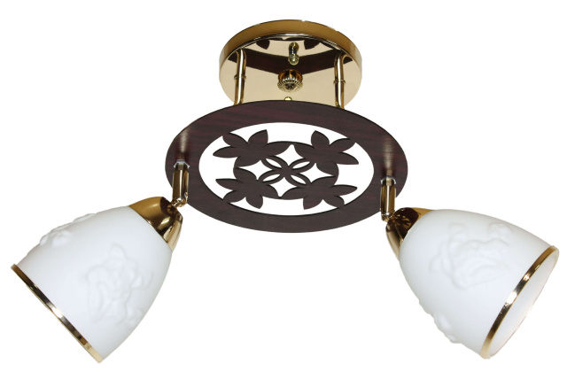 Высота (мм): 330; Ширина (мм): 510; Тип цоколя: Е27; Количество источников света: 2; Максимальная мощность люстры (Вт): 80; Вес (г): 800; Цвет основы: Золото (гальваника); Размер плафона (мм): 120; Тип крепления на потолок: Планка; Материал основы: Металл, дерево; Материал патрона: Термопластик; Материал плафона: Стекло, металл; Особенности: Поворотная; Количество в ящике (шт.): 6; Стиль: Классика; Площадь помещения: до 10 кв.м; Высота потолка: до 250 см;