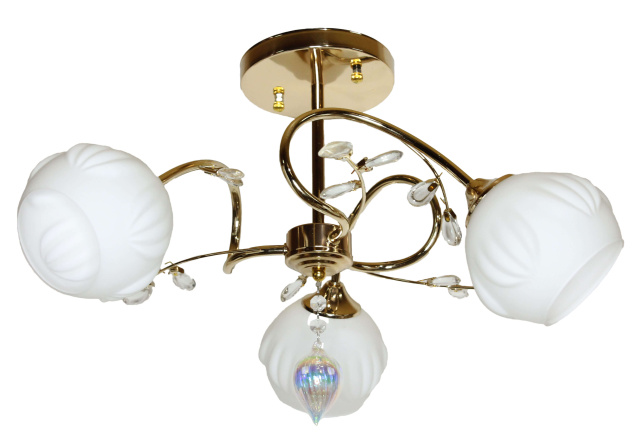 Высота (мм): 350; Ширина (мм): 500; Тип цоколя: Е27; Количество источников света: 3; Максимальная мощность люстры (Вт): 120; Вес (г): 1430; Цвет основы: Золото (гальваника); Размер плафона (мм): 100; Тип крепления на потолок: Планка; Материал основы: Металл; Материал патрона: Термопластик; Материал плафона: Стекло; Количество в ящике (шт.): 4; Стиль: Классика; Площадь помещения: от 10 до 20 кв.м; Высота потолка: до 250 см;