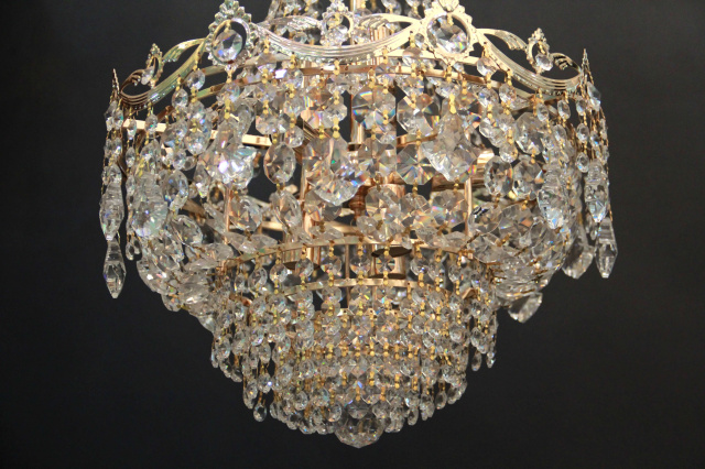 Высота (мм): 850; Ширина (мм): 460; Тип цоколя: Е27; Количество источников света: 9; Максимальная мощность люстры (Вт): 540; Вес (г): 5400; Цвет основы: Золото (гальваника); Тип крепления на потолок: Крючок; Материал основы: Металл; Материал патрона: Термопластик; Длина цепи (мм): 200; Цвет хрусталя : Белый; Количество в ящике (шт.): 1; Стиль: Классика; Площадь помещения: от 20 до 30 кв.м; Высота потолка: от 320 см до 400 см;